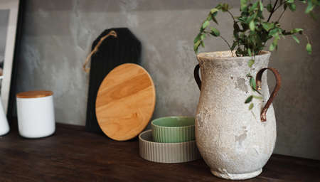 A vase with dry flowers on a table. Scandinavian classic kitchen, minimalistic interior design. Real photo. Cosy home.