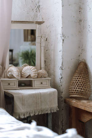 Vertical shot of small vintage dressing table with mirror and decorative shells on it against white concrete wall in loft style bedroom. Home interior design with antique furnishing concept