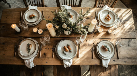 A rustic farmhouse table setting with ceramic plates, linen napkins, and candles, creating a cozy, homey atmosphere
