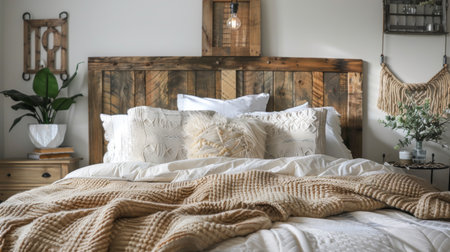 A soothing rustic bedroom retreat showcasing a reclaimed wood headboard, plush knit blankets, and a calming neutral color palette.