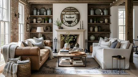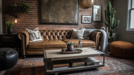 Living room decor, home interior design . Industrial Bohemian style with Brick Wall decorated with Leather and Metal material . Generative AI AIG26.