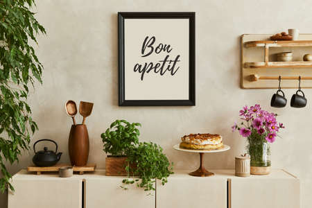 Elegant composition of stylish dining room intrerior with mock up poster frames, beige wooden commode, plants, bake and accessories. Template.