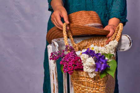 female hands on a wooden table. Artificial flowers. Wooden texture.