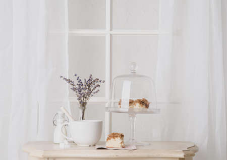 Home interior. Cookies, coffee. Apple tree color, bird. Blurred background