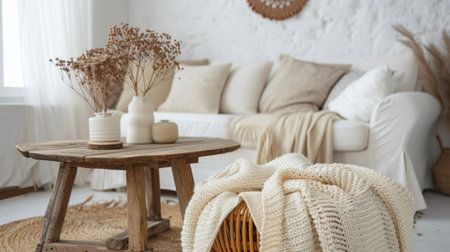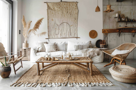 Elegant Scandi-boho living room with a mix of Scandinavian simplicity and bohemian charm, highlighted by natural materials and earthy tones