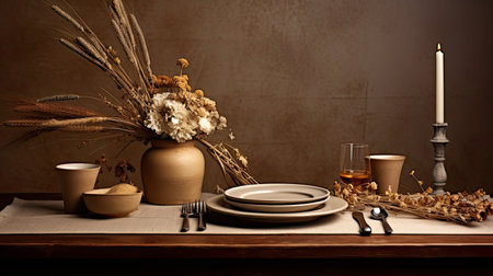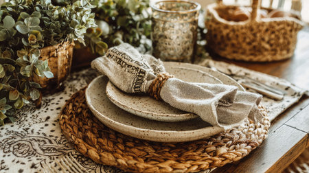 This image showcases a cozy rustic table setting with natural elements, featuring plates, woven items, and greenery for an inviting dining experience.