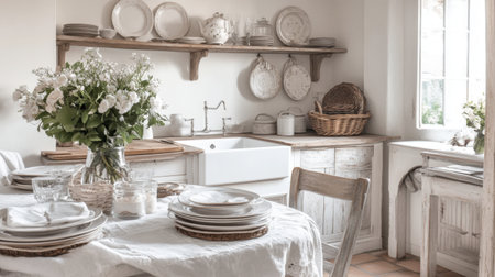 A cozy rustic kitchen featuring a floral centerpiece, neatly arranged plates, and wooden shelves, creating a warm and inviting atmosphere for dining.