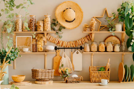 A cozy still life with decor details and a bouquet of dried flowers in the interior of a room in a Scandinavian style.