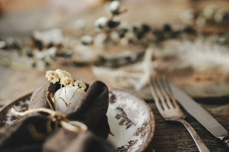 Rustic Easter table setting. Natural egg in napkin with flowers, setting with vintage plate, cutlery, pussy willow branches on aged wooden table. Easter table decoration