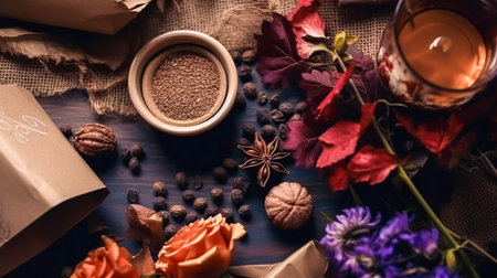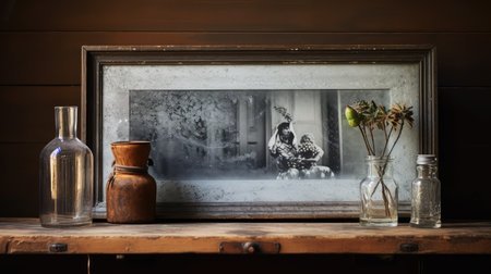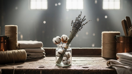 A charming rustic still life arrangement featuring dried flowers, wooden objects, glass jars, and vintage containers, creating a warm, nostalgic atmosphere.