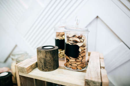 Hazelnuts and almonds in a glass jar on the table in a restaurant