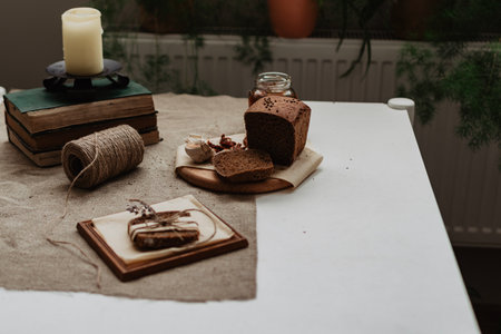 Rustic christmas still life with rustic christmas cookies, candles and copy space