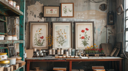 A charming vintage art display showcasing handcrafted cards and decorations on a wooden wall. The cozy creative space is enhanced by a beautiful floral arrangement, inspiring creativity.