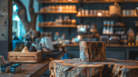 Rustic interior of a store with wooden tables and shelves, showcasing a warm and cozy atmosphere with various items on display.
