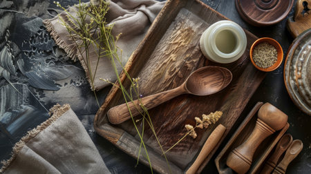 Cozy rustic kitchen setting featuring wooden utensils, spice jar, and natural elements on a dark background.