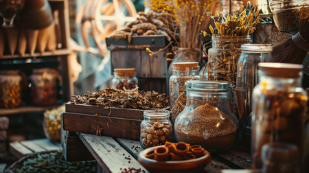 Assortment of jars filled with dried herbs, spices, and grains on a rustic market display, evoking a cozy and traditional atmosphere.