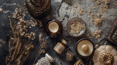 A serene flat lay with candles, dried flowers, and decorative items, creating a cozy and inviting atmosphere
