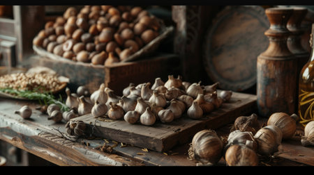 Close-up of a rustic kitchen table featuring assorted nuts, garlic cloves, herbs, and vintage containers, evoking a cozy, traditional atmosphere.