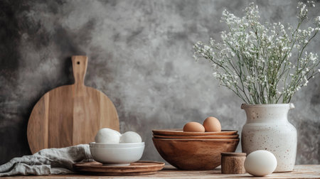 A rustic breakfast setup featuring a wooden cutting board, eggs, and natural lighting for a cozy ambiance.