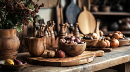 A cozy rustic kitchen setup featuring wooden utensils and fresh ingredients, evoking warmth and traditional charm.