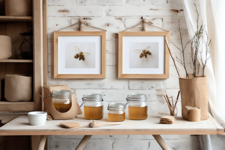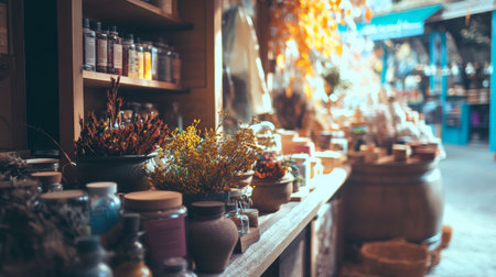 An outdoor market scene showcasing jars and artisanal products on display under soft natural lighting, creating a lively ambiance.