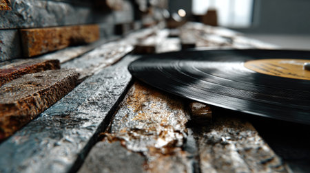 A close-up image featuring a vintage vinyl record resting on a rugged wooden surface, evoking a sense of nostalgia and artistic charm in a cozy setting.