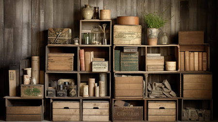 A nostalgic vintage apothecary setup featuring wooden shelves lined with bottles and natural elements, creating a moody atmosphere.