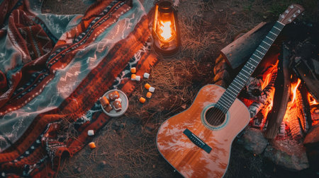 A Tartan guitar lies beside a blazing campfire, adding a touch of plaid pattern to the rustic setting. The warm glow of the fire creates a cozy atmosphere for recreational musicmaking AIG50