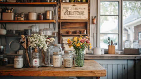A rustic farmhouse kitchen adorned with vintage decorations, including a wooden sign, mason jars, and a collection of fresh flowers.