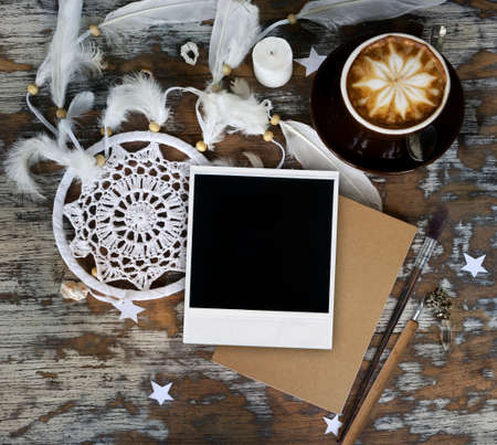 Boho cracky background for mockup with cup of cappuccino. Desk for artist, painter. Copy space for text. Natural, rustic, ethnic or hipster vintage mock up. Top view. Shabby chic style workplace