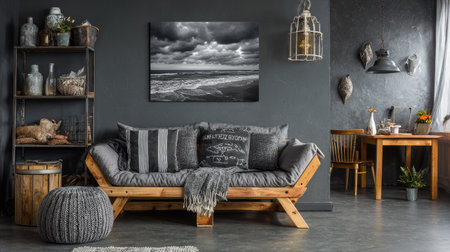 A stylish living room presents a wooden sofa with decorative cushions and a neutral-toned color palette. The room showcases a monochromatic artwork, a wooden table, and diverse ornamental elements. The setting suggests an indoor environment illuminated by soft lighting. Suitable for use in design publications and commercial projects.