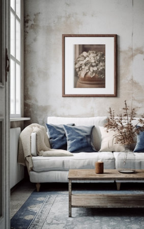 Scandinavian farmhouse bedroom interior, poster frame mockup, 3D render