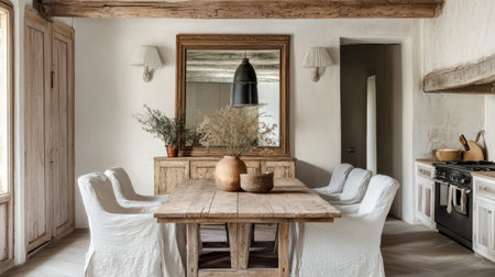 A cozy dining room features a large vintage mirror with a wooden frame, complementing the rustic wooden table and comfortable chairs. Natural decor enhances the inviting atmosphere.
