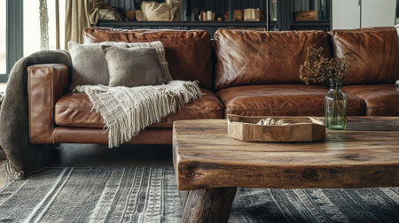 A cozy living room features a distressed leather sofa adorned with decorative pillows and a soft throw. A rustic wooden coffee table sits in front, enhancing the room's charm and character.