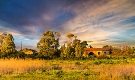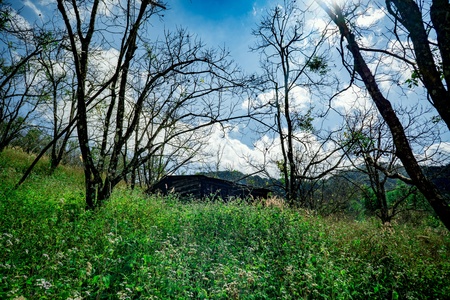 Rural autumn landscape with a small shabby shack next to leafless plane trees, in a vineyard near Bento Goncalves. A friendly country town in southern Brazil famous for its wine production.