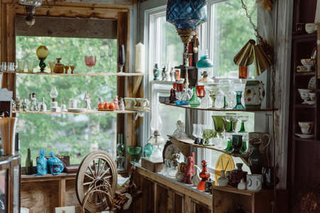 Nova Scotia, August 2018: Collection of antique, used, vintage things for sale at flea market. Souvenir shop with antiques