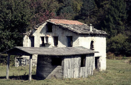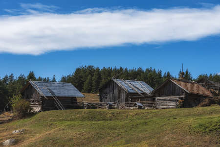 Small abandoned wooden hut in the middle of Alpian evergreen forest