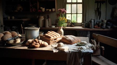 an old kitchen with bread on the table and flowers in the window sie, next to it is a bunch of sunflower
