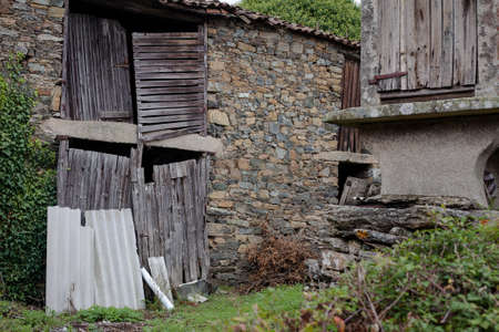 Worn stone storage shed & grain storage in rural Galicia, Spain on a grey day with metal sheets covering doorway.