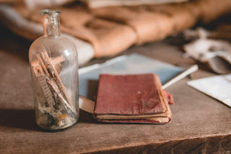 A vintage photograph is displayed in a worn frame on the wall, while various antique items, including clocks and jars, are arranged on a rustic table, evoking nostalgia.