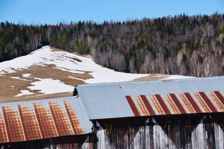 abandoned livestock farm building at rural countryside closed due to payment delay. big barn granary storehouse. financial crisis strikes agricultural industry concept. wide outdoo
