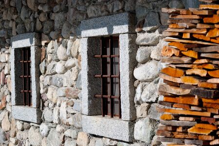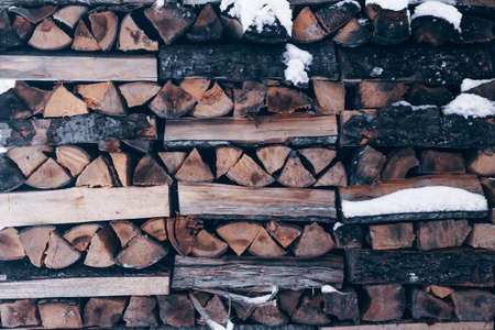 Chopped firewood pile. Woodpile board wall. Wood. Old dry pine wooden heap. Brown color textured background. Natural resources. Rural solid fuel. Winter preparation. Rustic style pattern. Woodworking.