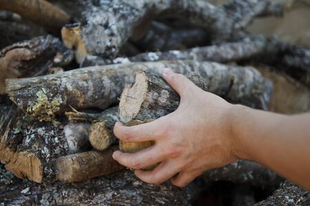 Side view of woodpile of cut firewood logs and branches. Rustic fuel concept. Rough wooden textures of tree trunk cross sections and tree bark