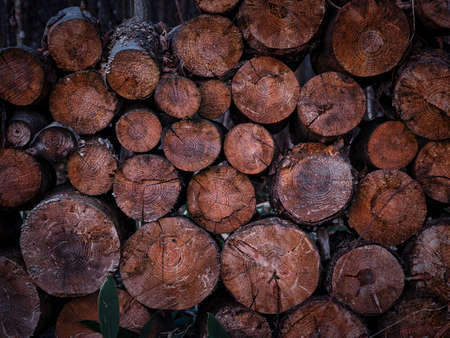 Natural wooden logs cut and stacked in pile, felled by the logging timber industry, Abstract photo of a pile of natural wooden logs background