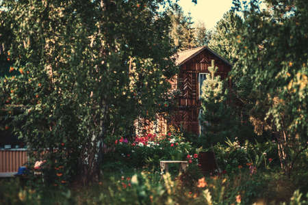 View of a sunlit garden with trees, bushes, and small flowers in a defocused foreground and a wooden house surrounded by birches in the background. A log dacha cottage in the shadow of a birch forest