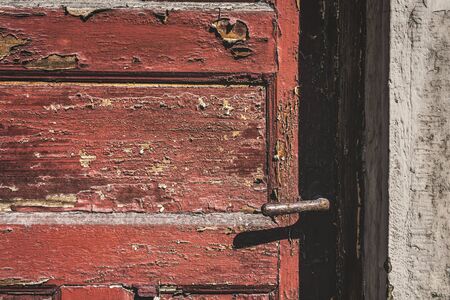 Weathered red door close-up with the rusty door handle and the cracked red paint. Closed door.