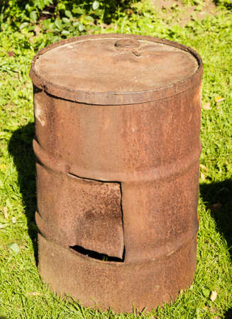 Rusty, old barrel stands outdoors in the countryside. Close-up.