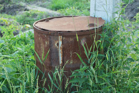 one closed old rusty metal brown barrel on the street overgrown with green grass and vegetation
