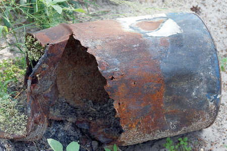 one old broken rusty iron brown black barrel lies on the ground in the street