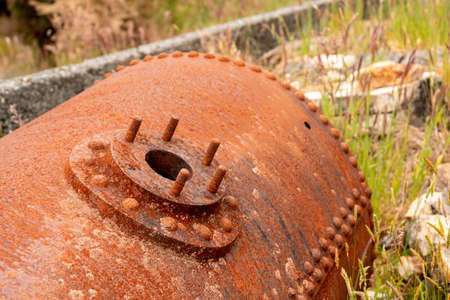 metal rusty barrel, textured rusty metal background, open lid on rusty grunge texture of old metal fuel or liquid chemical tank, galvanized steel oil tank that weathered corrosion.